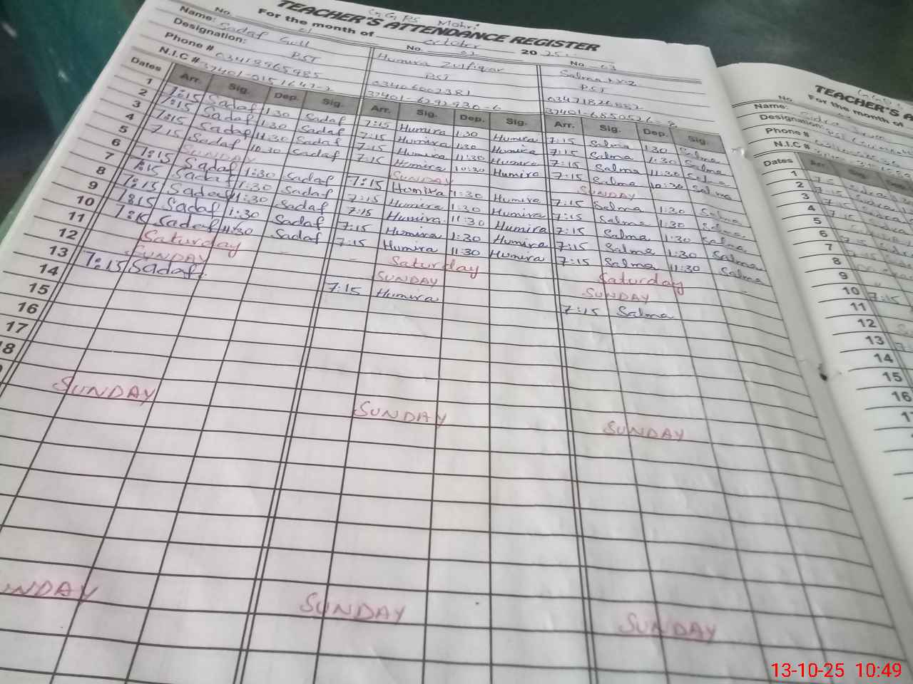 | CNIC | Full Name | Designation | R/C | Absence during last cal. month |