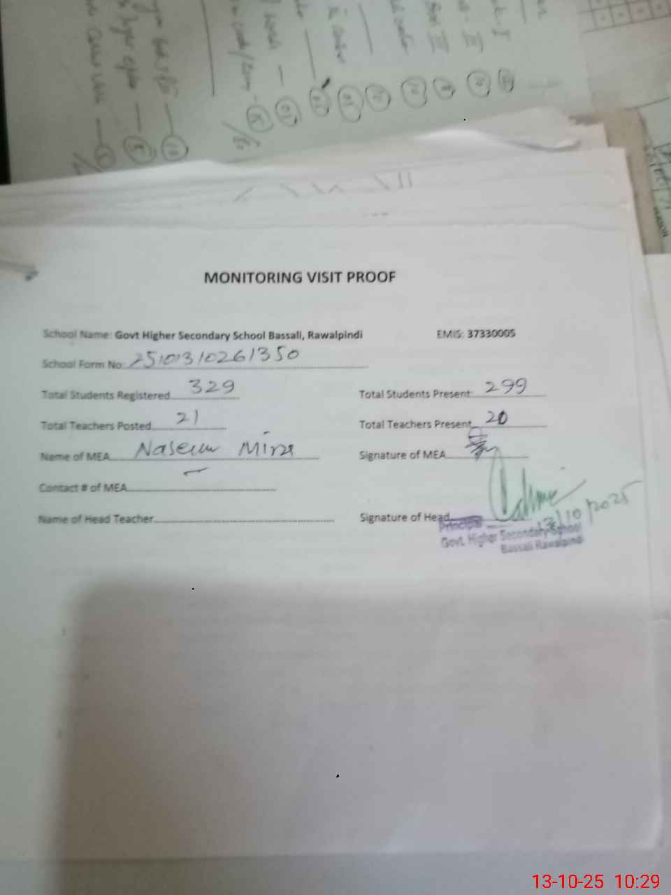 | Monitoring Date: 13-10-2025 | Start Time: 13-10-2025 09:35 AM | End Time: 13-10-2025 10:29 AM | Name of MEA: Na**** Sh**** | |