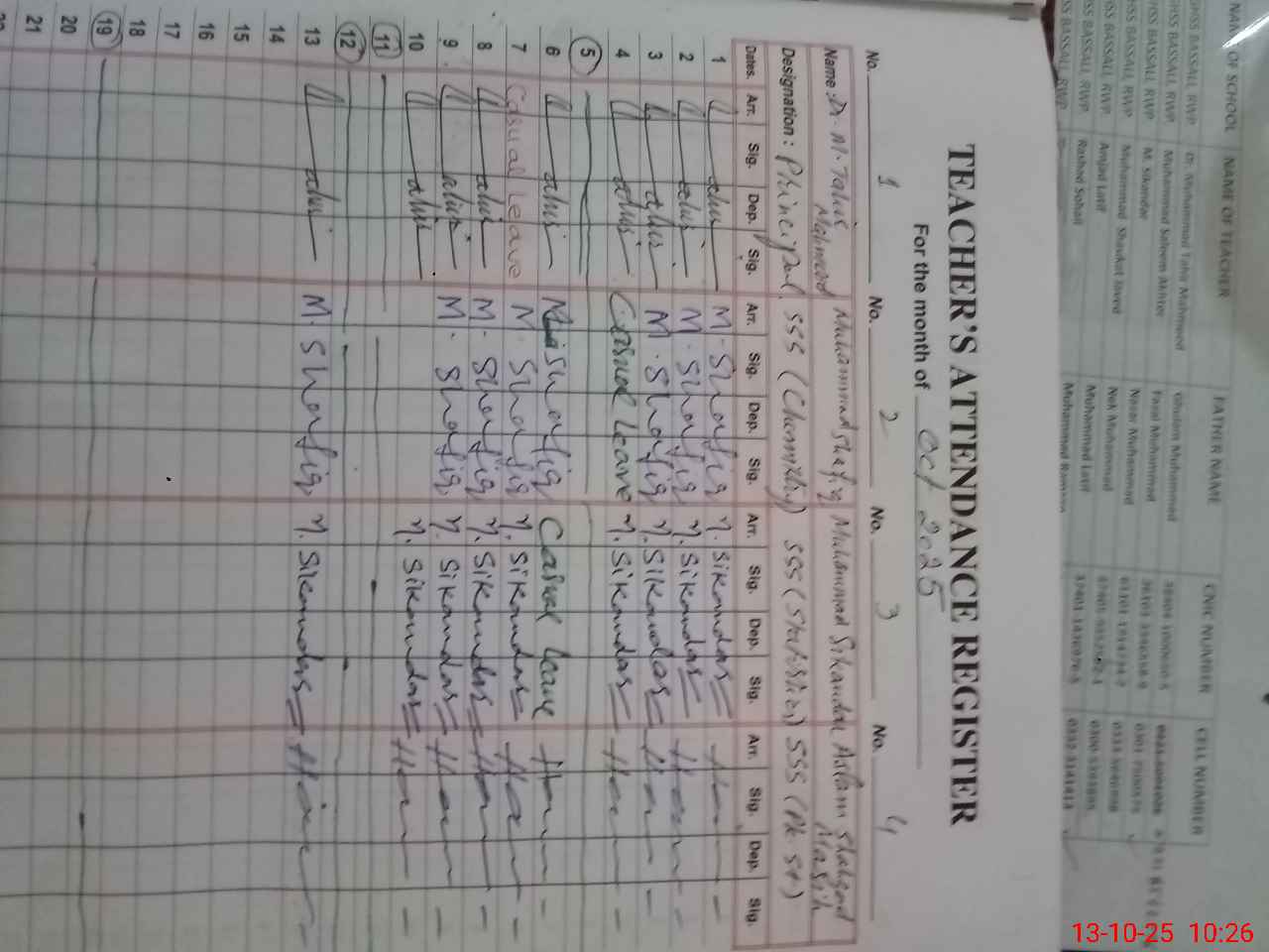 | CNIC | Full Name | Designation | R/C | Absence during last cal. month |
