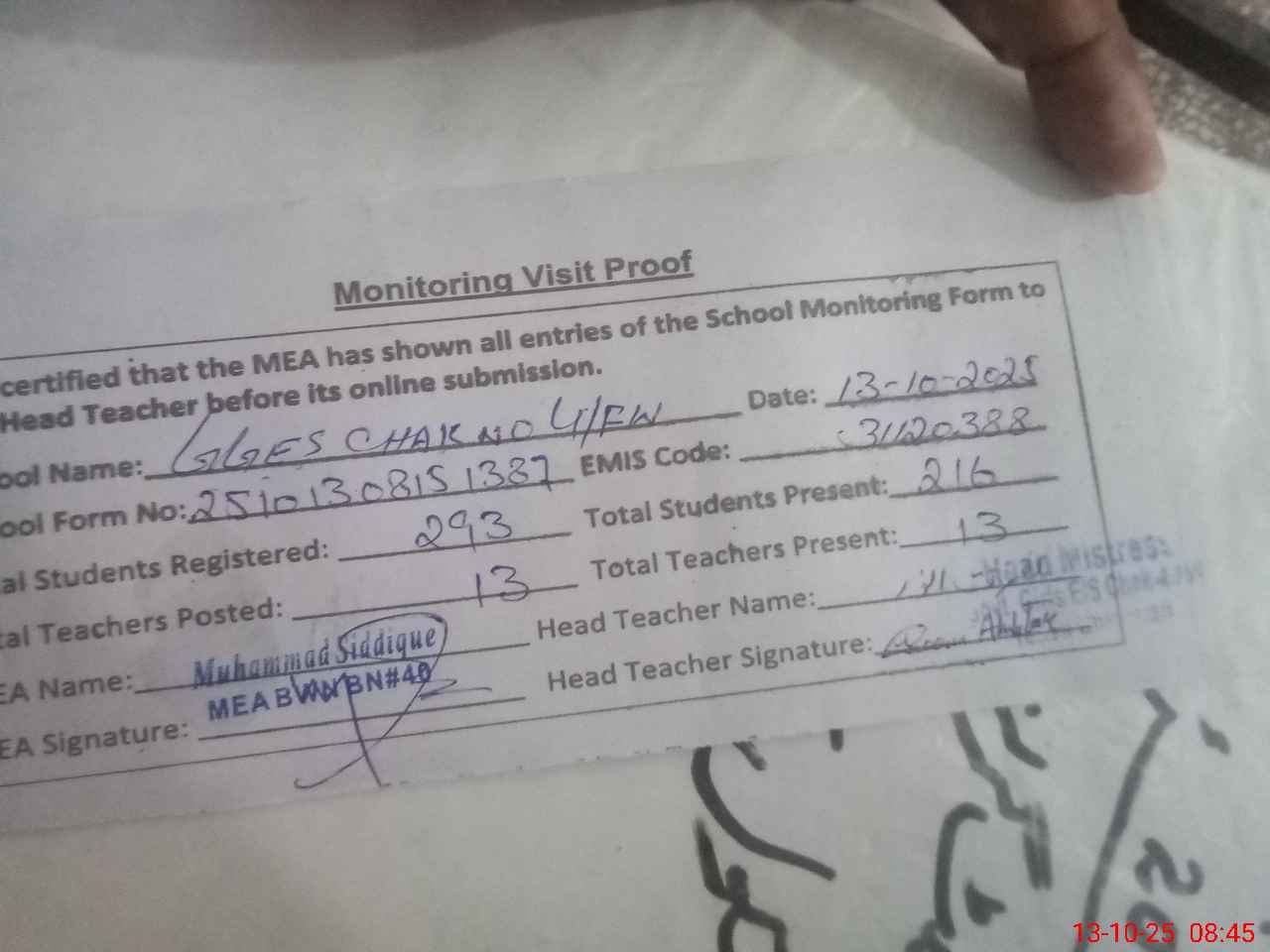 | Attendance Register | Head Teacher | MEA with School | Visit Proof |