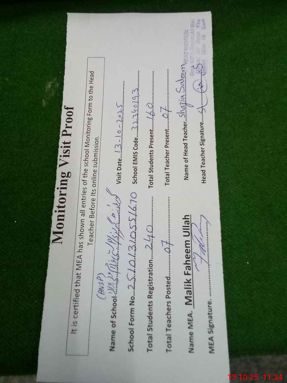 | Attendance Register | Head Teacher | MEA with School | Visit Proof |