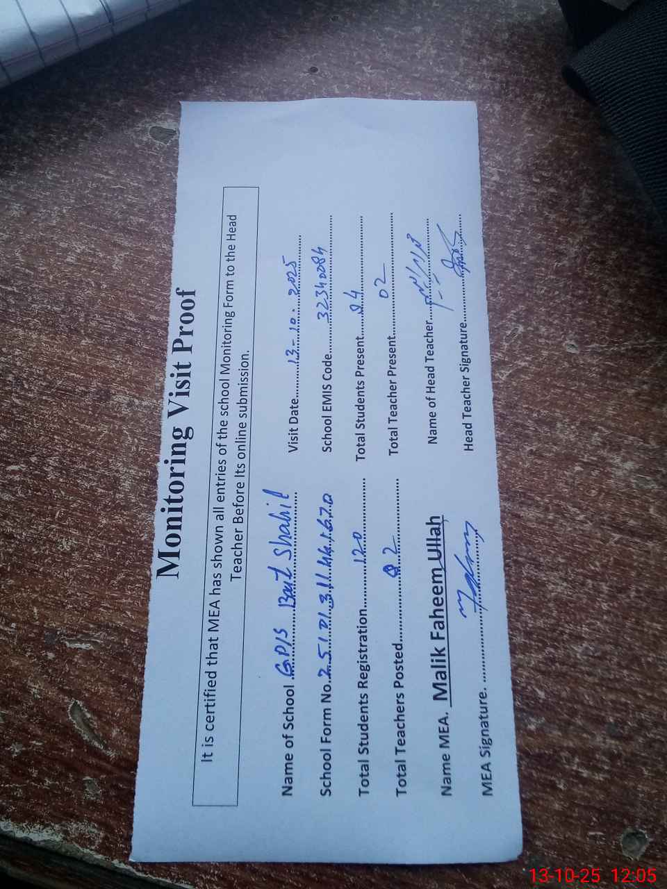 | Attendance Register | Head Teacher | MEA with School | Visit Proof |
