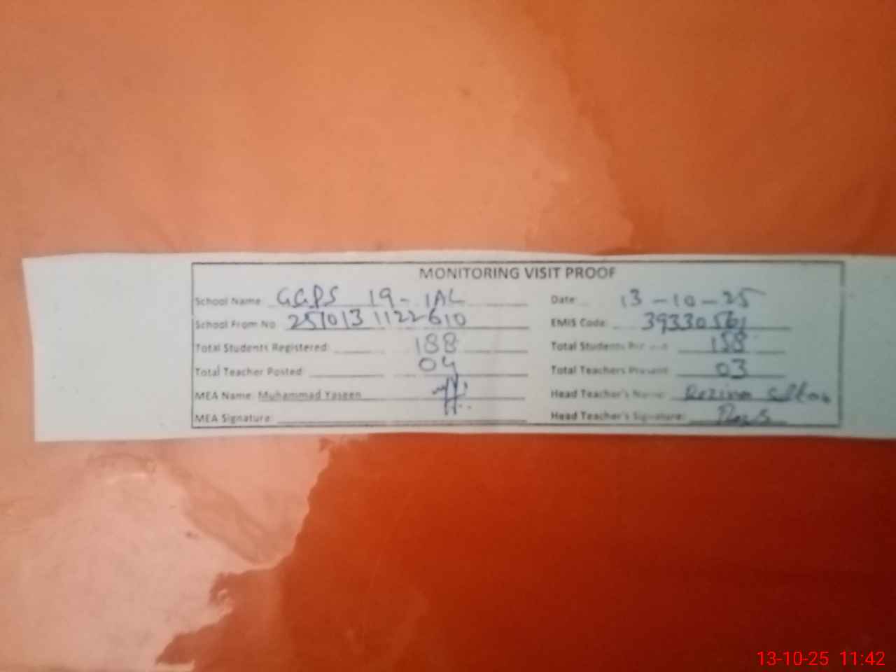 | Attendance Register | Head Teacher | MEA with School | Visit Proof |