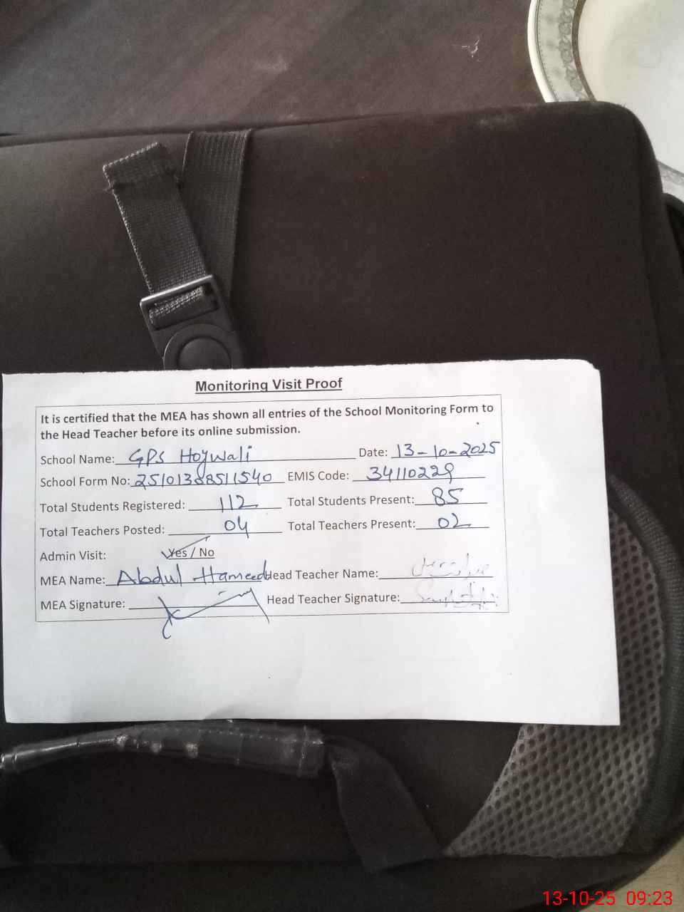 | Attendance Register | Head Teacher | MEA with School | Visit Proof |