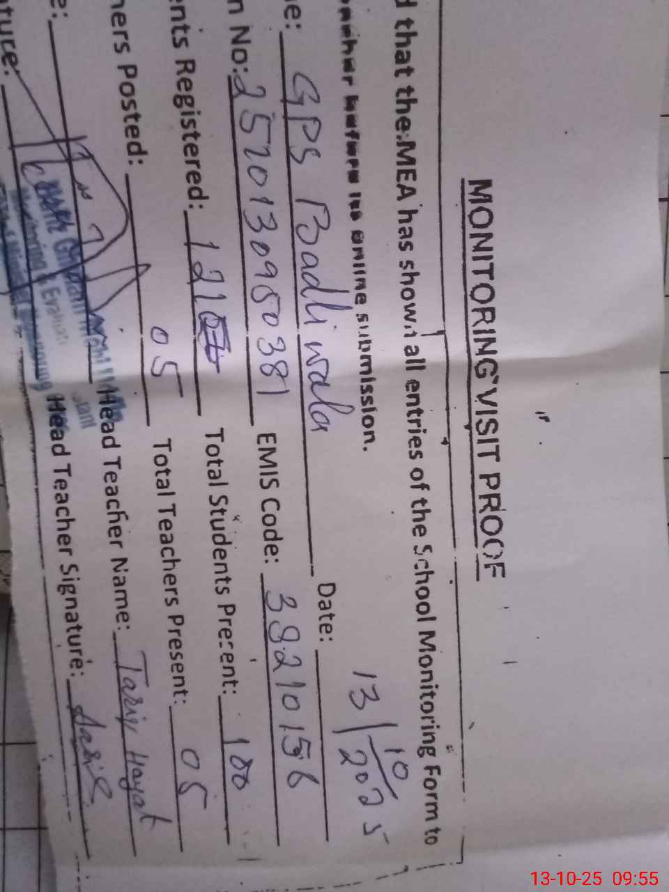 | EMIS Code: 38210156 | Name of School: GPS BADLI WALA | |||