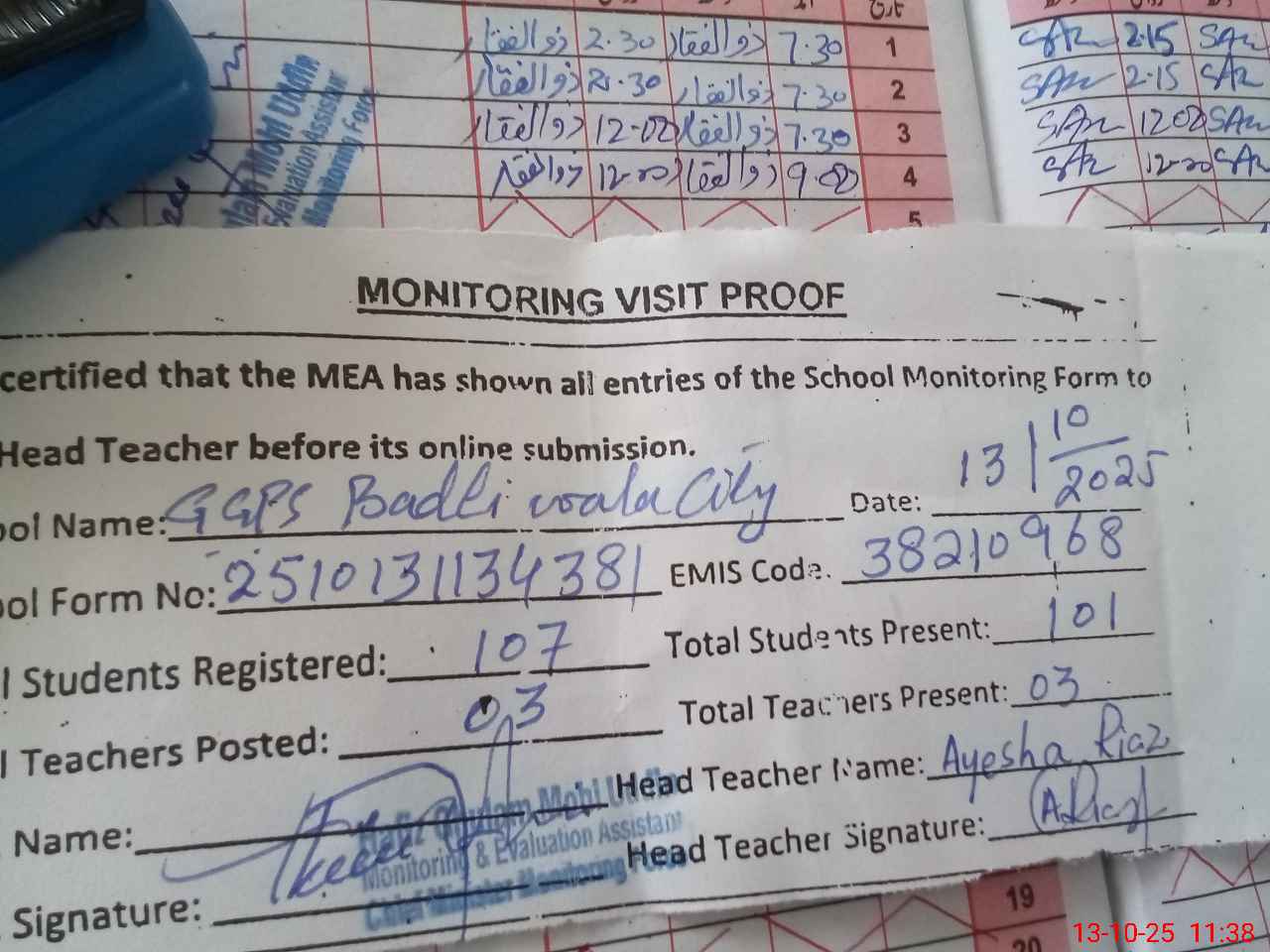 | Attendance Register | Head Teacher | MEA with School | Visit Proof |