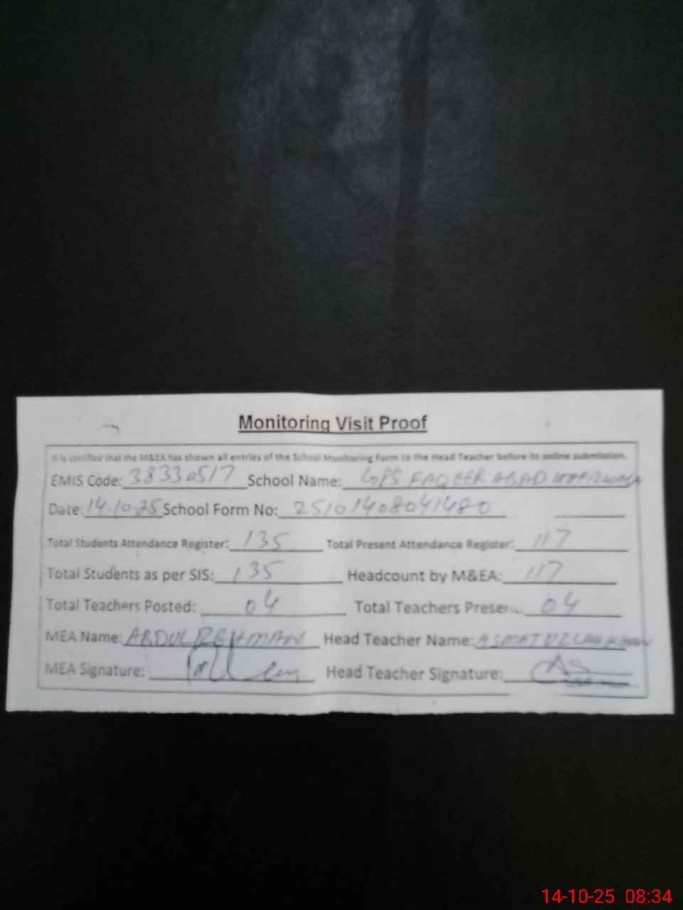 | Attendance Register | Head Teacher | MEA with School | Visit Proof |