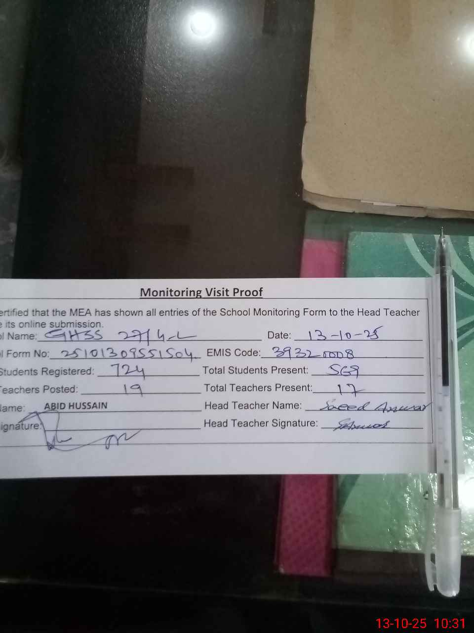 | Attendance Register | Head Teacher | MEA with School | Visit Proof |