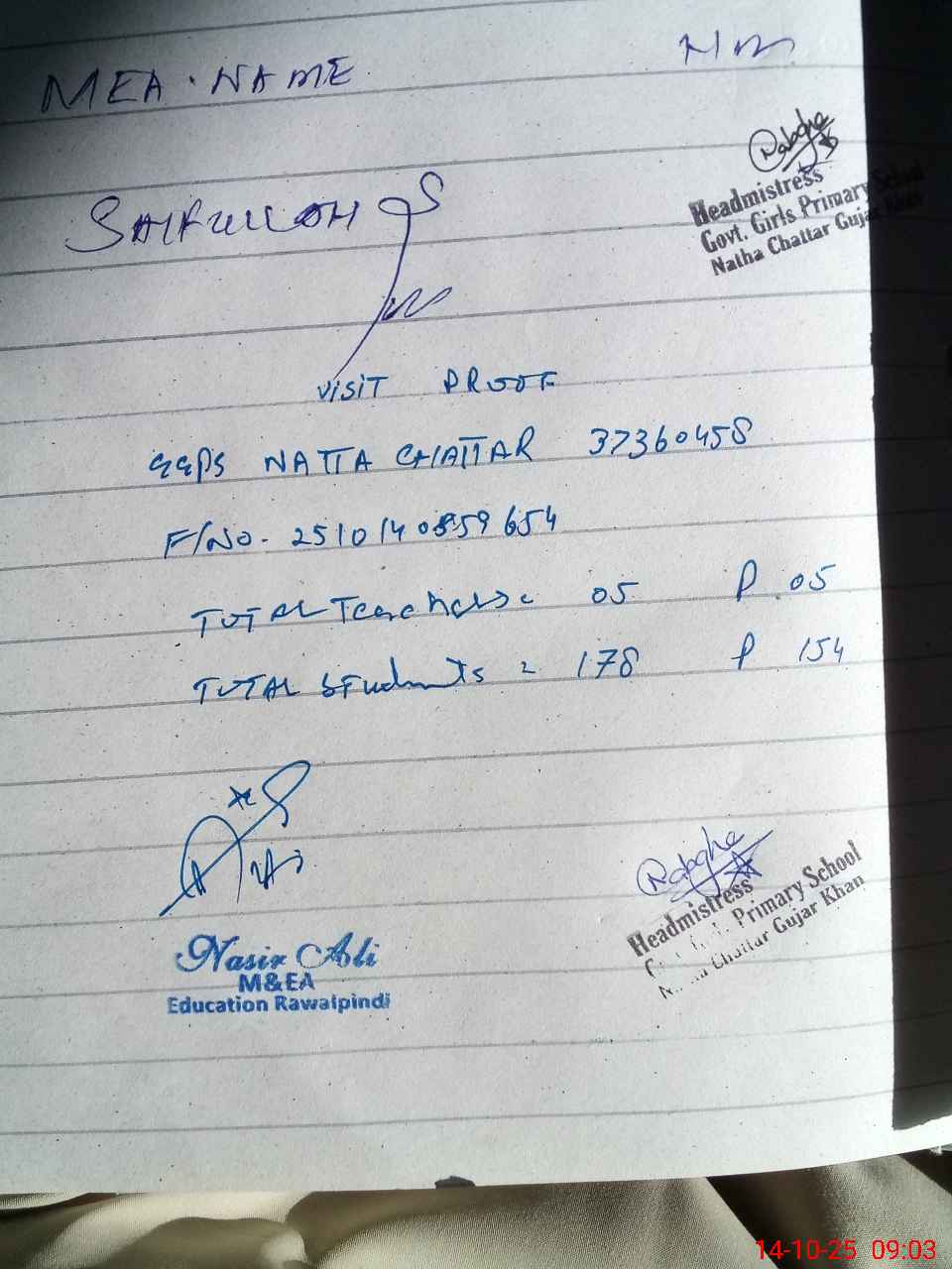 | Attendance Register | Head Teacher | MEA with School | Visit Proof |