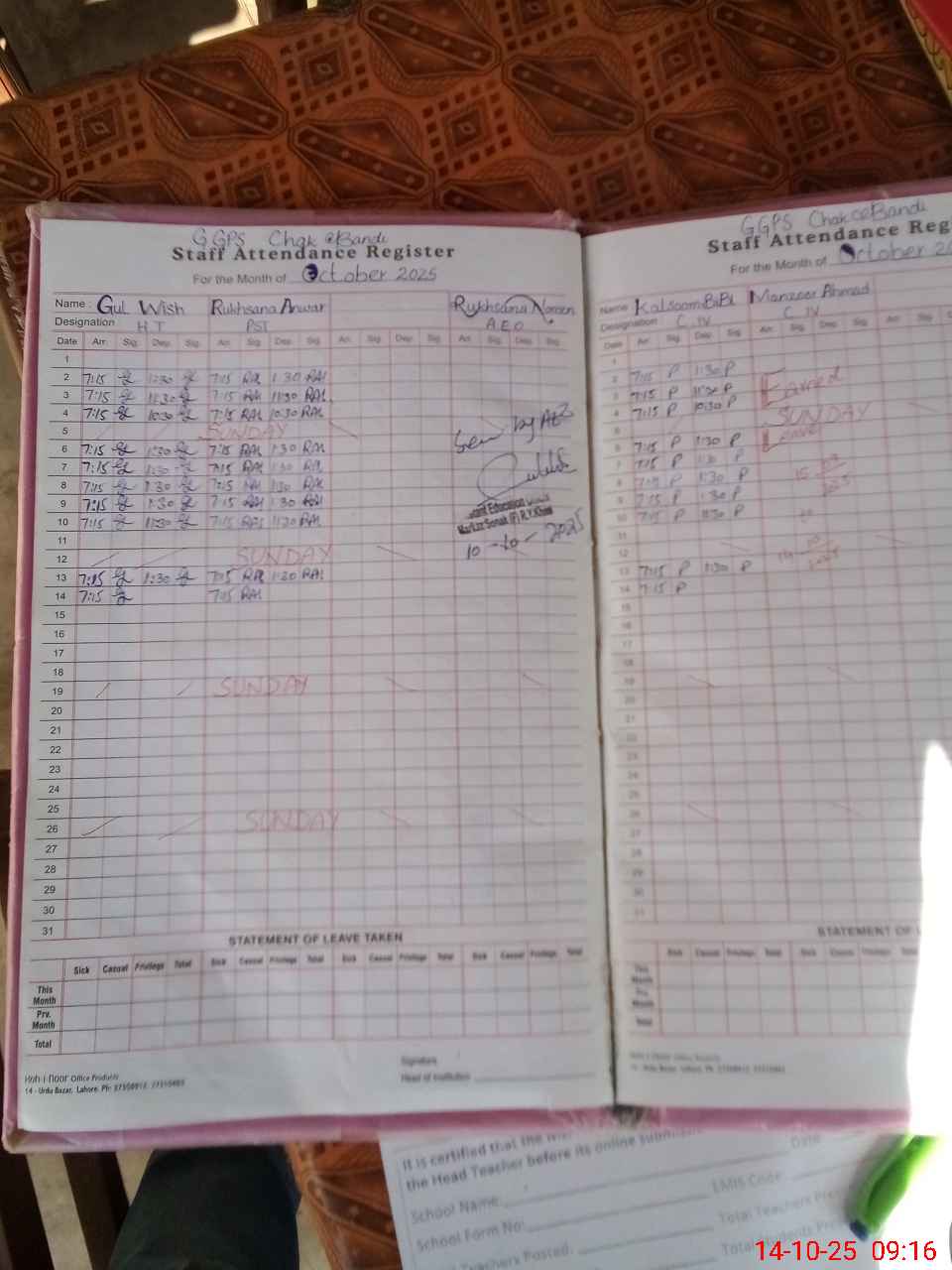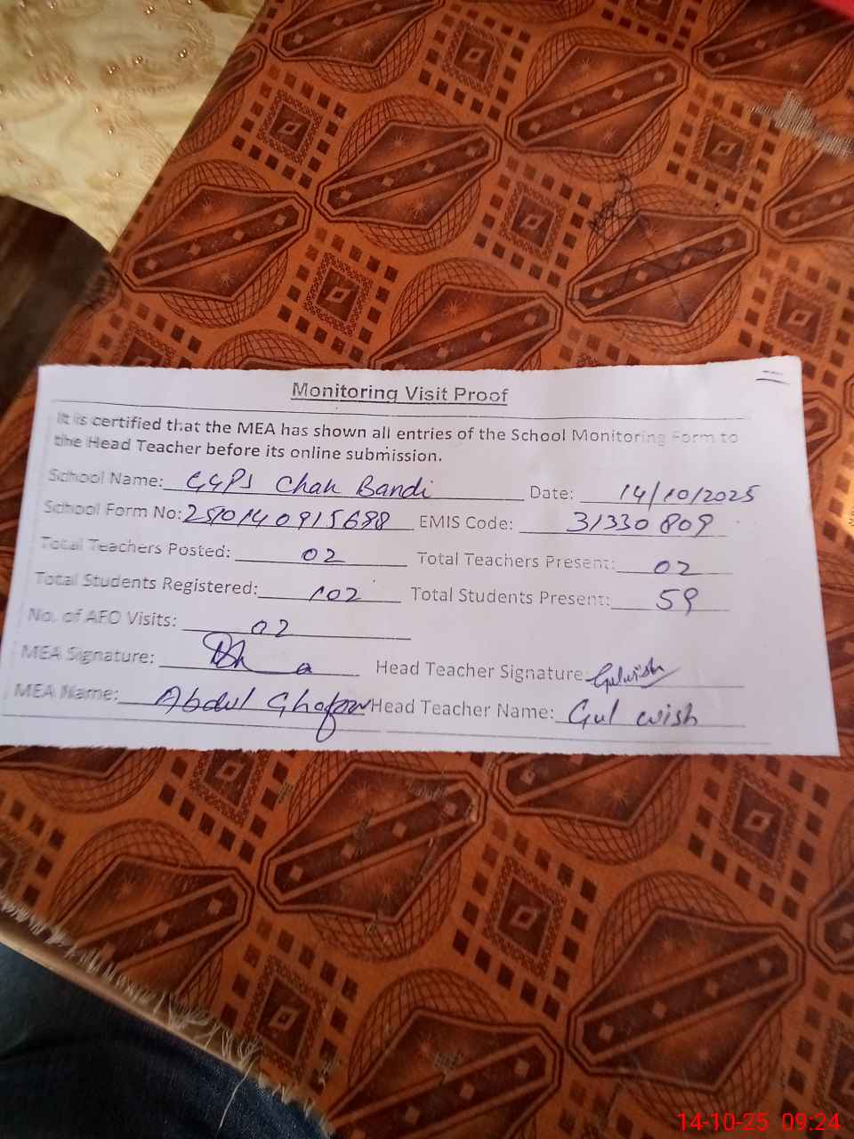 | Attendance Register | Head Teacher | MEA with School | Visit Proof |