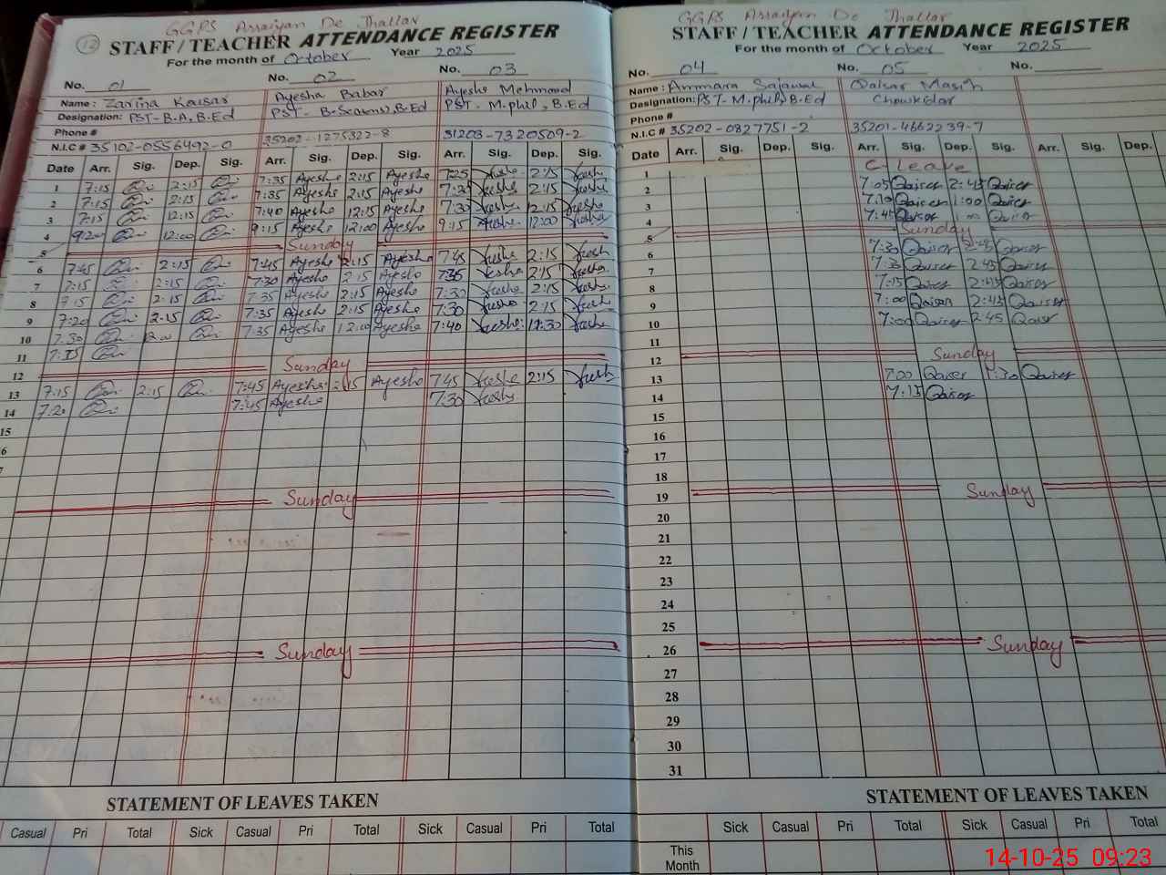 | Remarks (Use Separate Page if Required): PST teacher Ammarah Sajawal have resigned from service since 11th September 2025 still not approved so marked her absent as per SOP Furniture required for thirty students as told by head teacher boundary wall height is about five feet also not have barbed wire Complete outside school building and boundary wall required distemper paint and repairs work One class room roof found leak required repairs work counted it in partially dangerous class room by head 36220428 | |||||