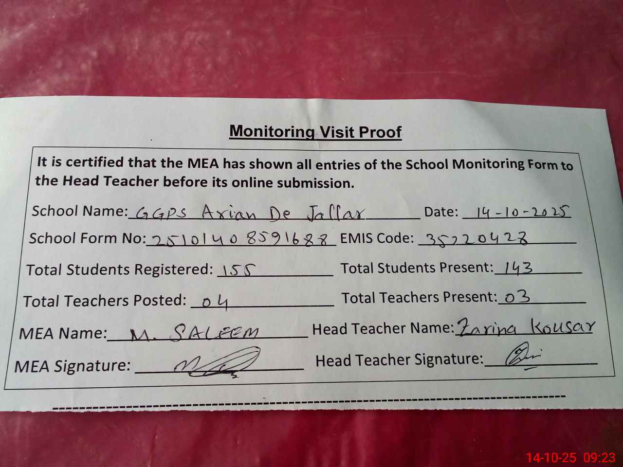 | Attendance Register | Head Teacher | MEA with School | Visit Proof |