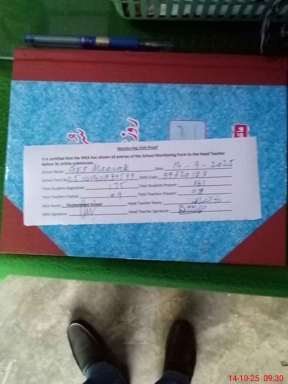 | Attendance Register | Head Teacher | MEA with School | Visit Proof |