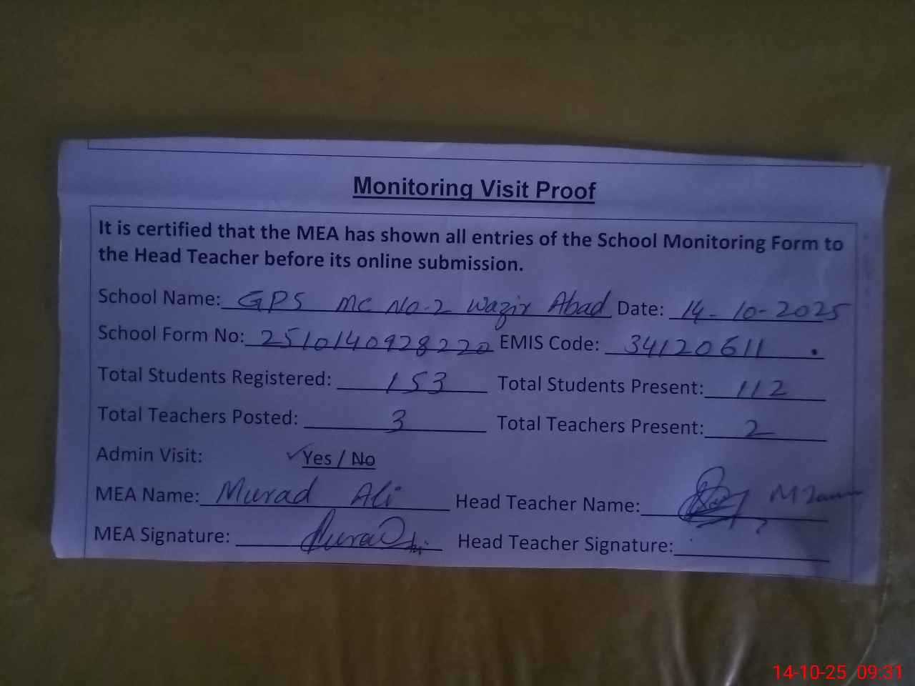 | EMIS Code: 34120611 | Name of School: GPS MC NO.02 WAZIRABAD | |||