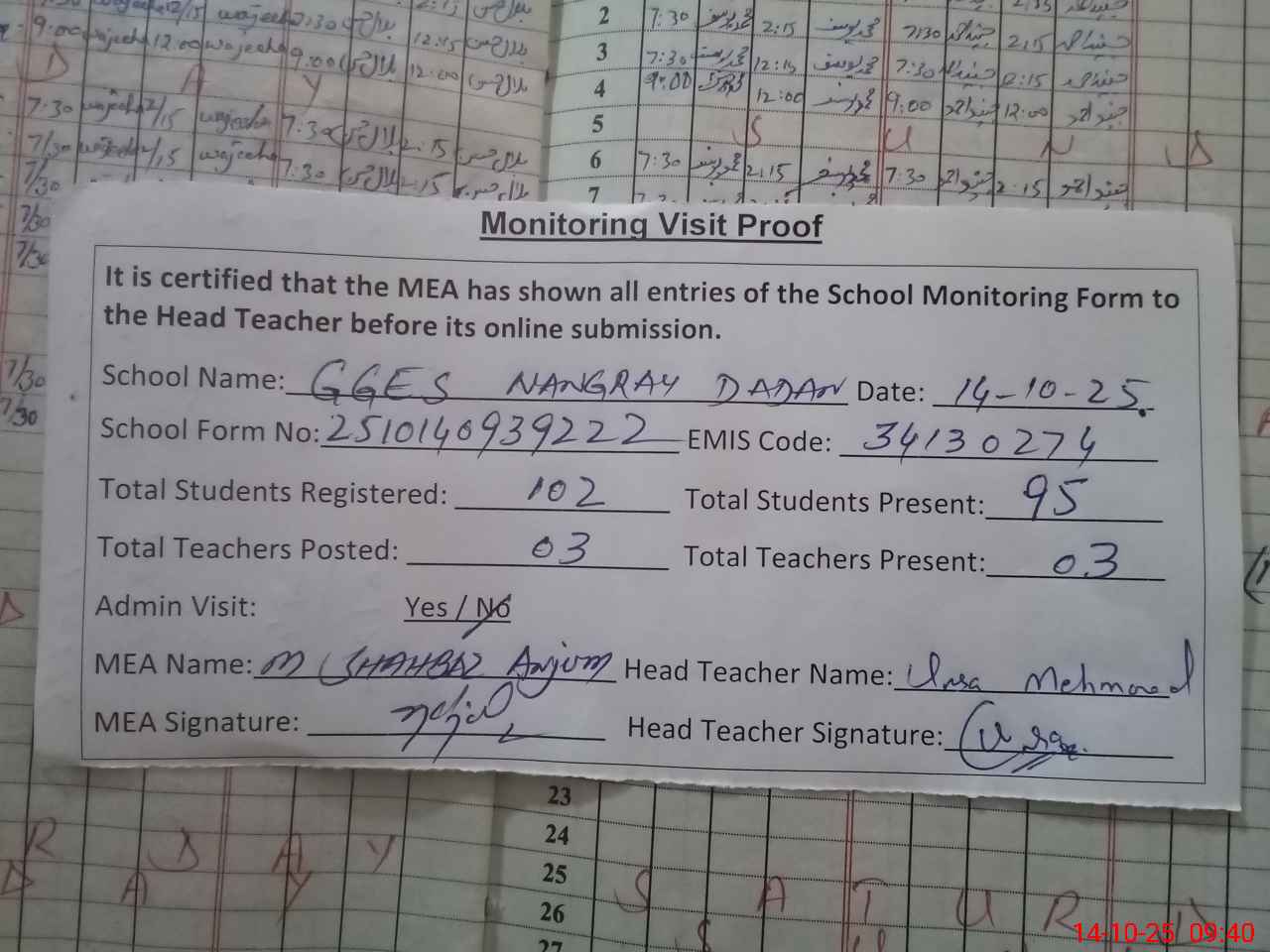 | Attendance Register | Head Teacher | MEA with School | Visit Proof |