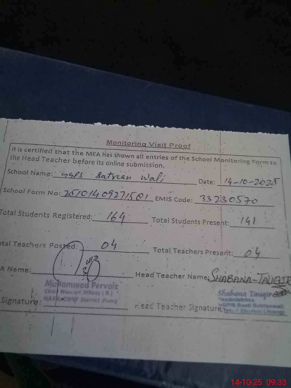 | Certified that this School was Inspected by the Undersigned MEA/DMO Today and the Information Stated Above is as Per Record. | |||||