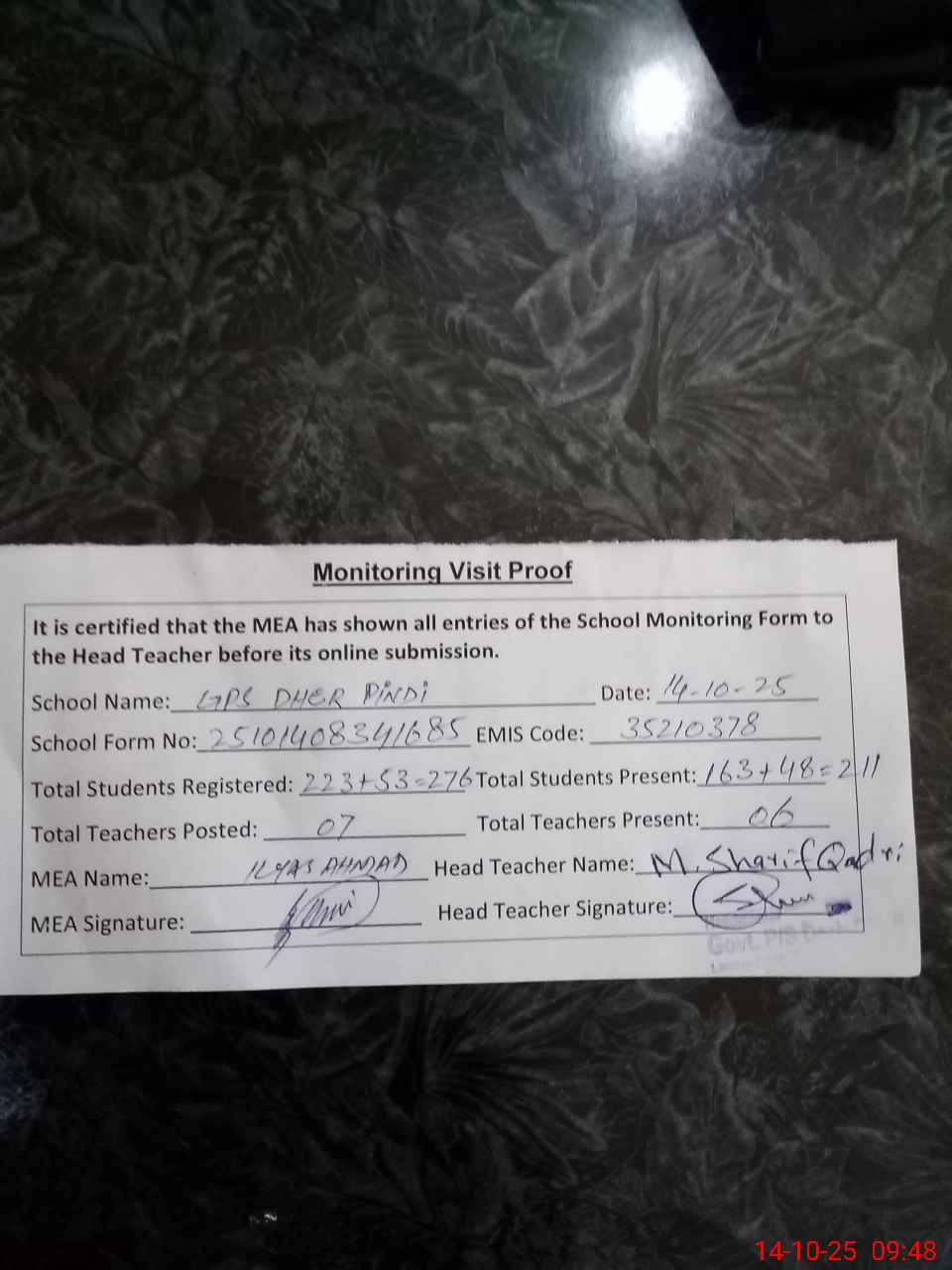 | EMIS Code: 35210378 | Name of School: GPS DHER PINDI | |||
