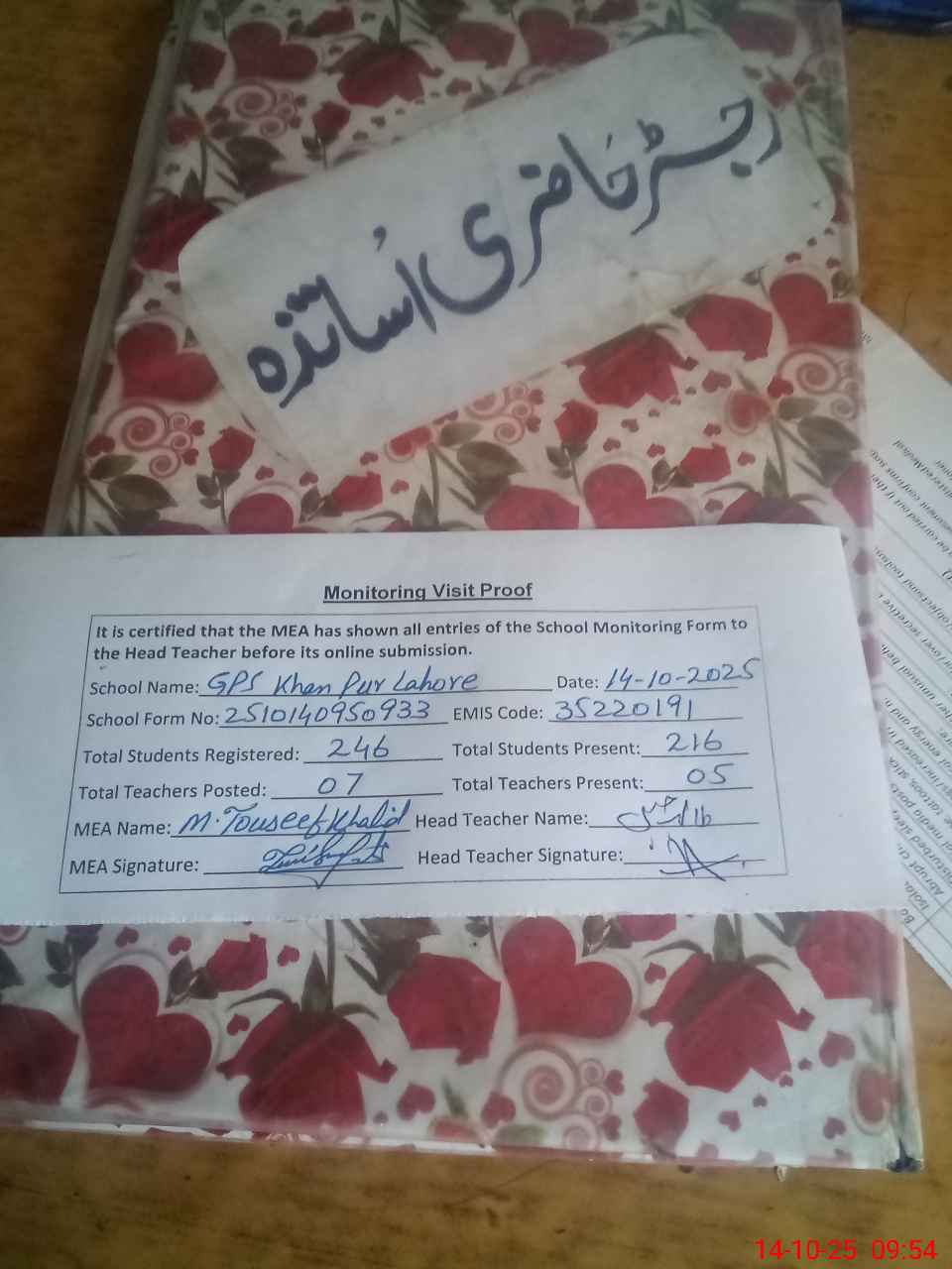 | EMIS Code: 35220191 | Name of School: GPS KHAN PUR LAHORE | |||