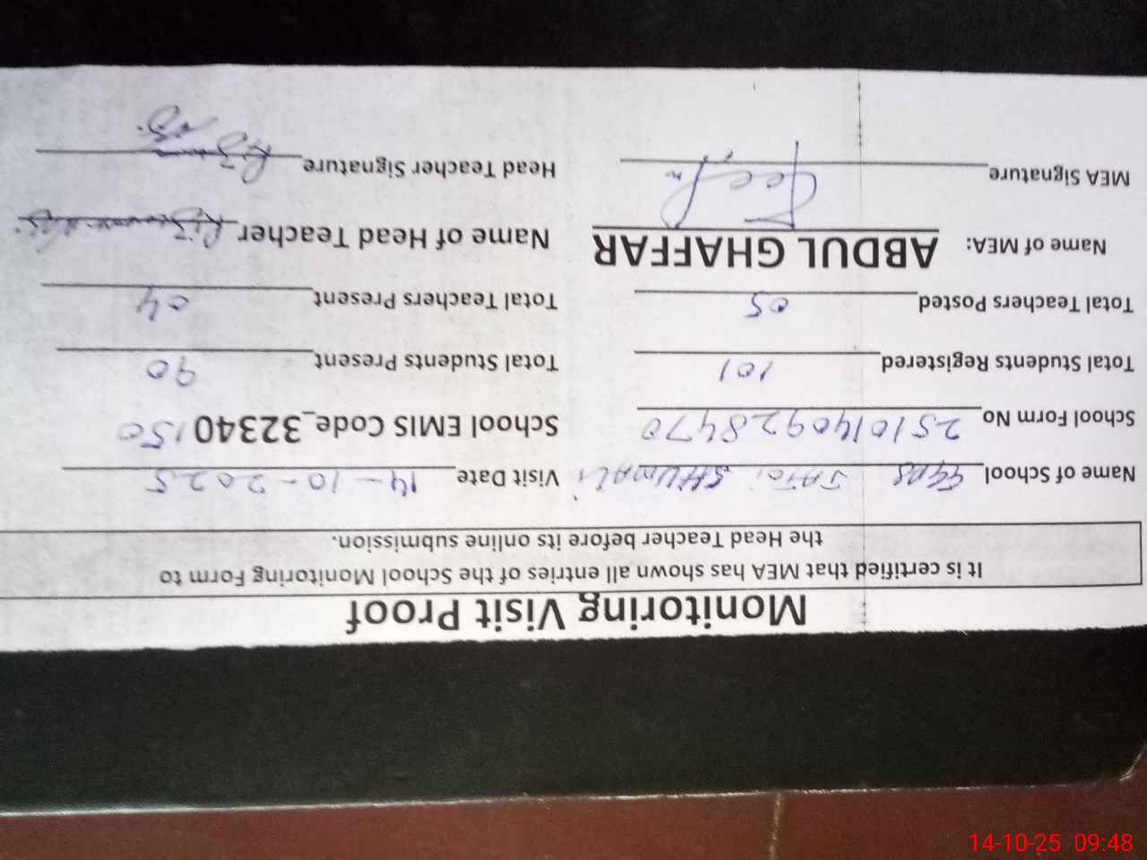| Attendance Register | Head Teacher | MEA with School | Visit Proof |