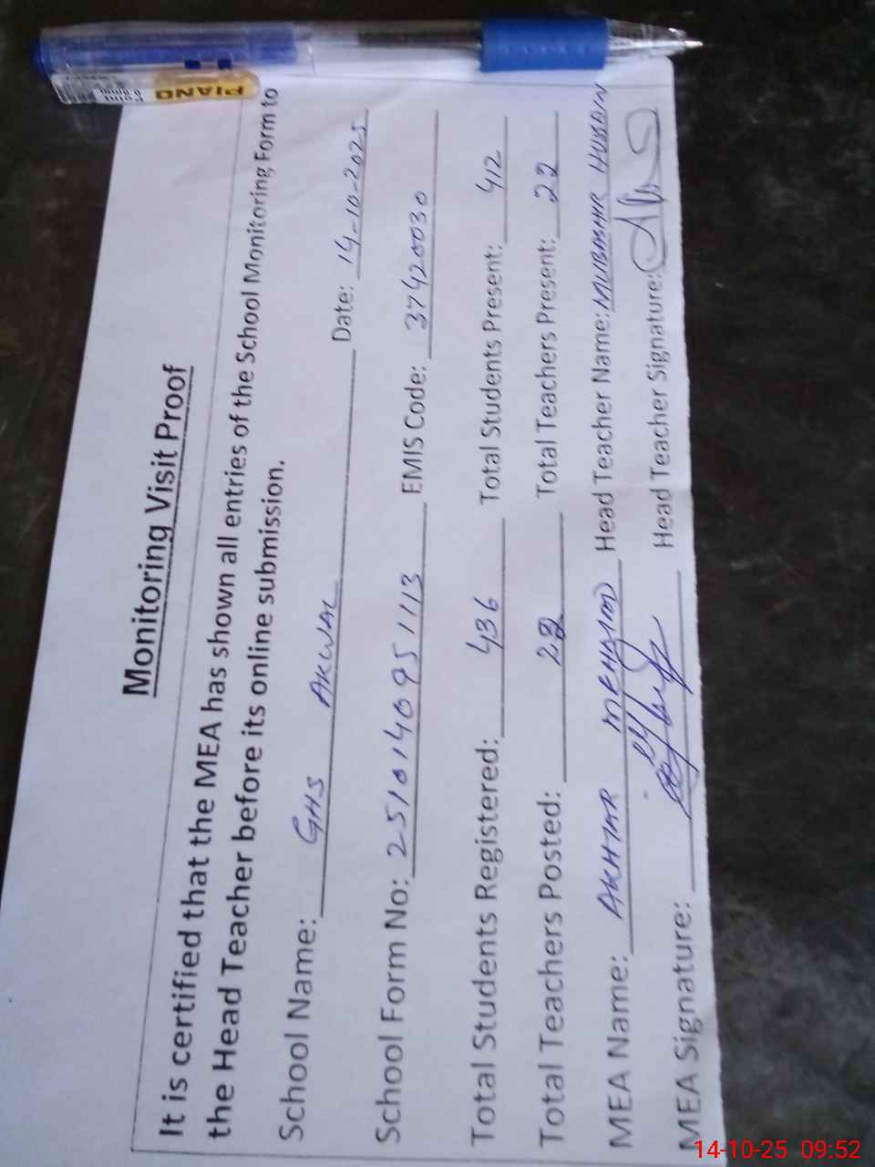 | Attendance Register | Head Teacher | MEA with School | Visit Proof |