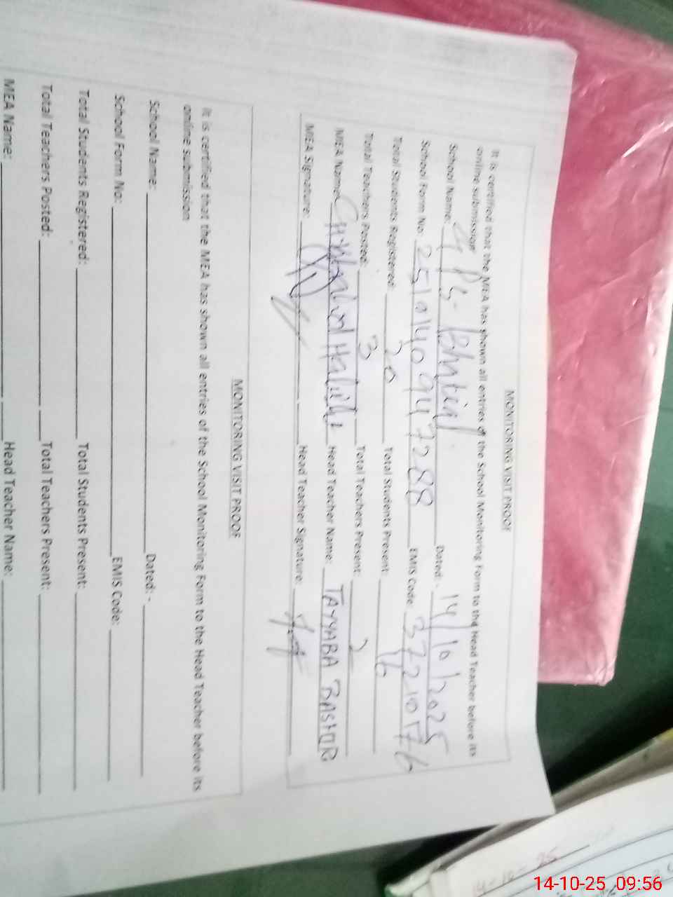 | Attendance Register | Head Teacher | MEA with School | Visit Proof |