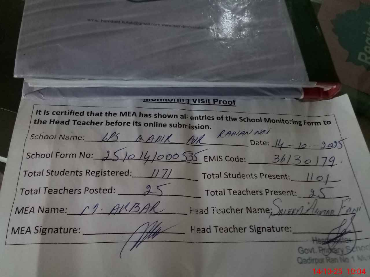| Attendance Register | Head Teacher | MEA with School | Visit Proof |