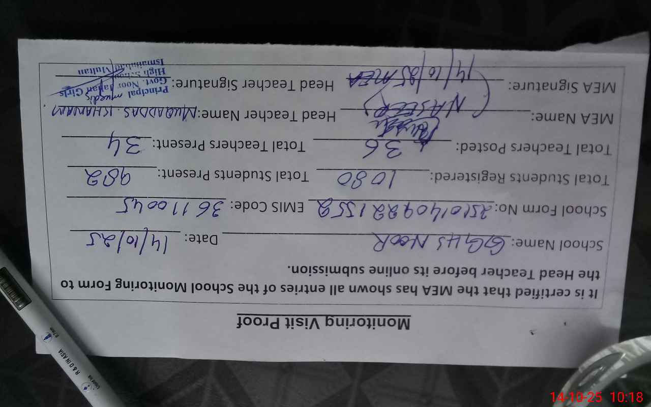 | Monitoring Date: 14-10-2025 | Start Time: 14-10-2025 09:22 AM | End Time: 14-10-2025 10:18 AM | Name of MEA: Na**** Ah**** | |