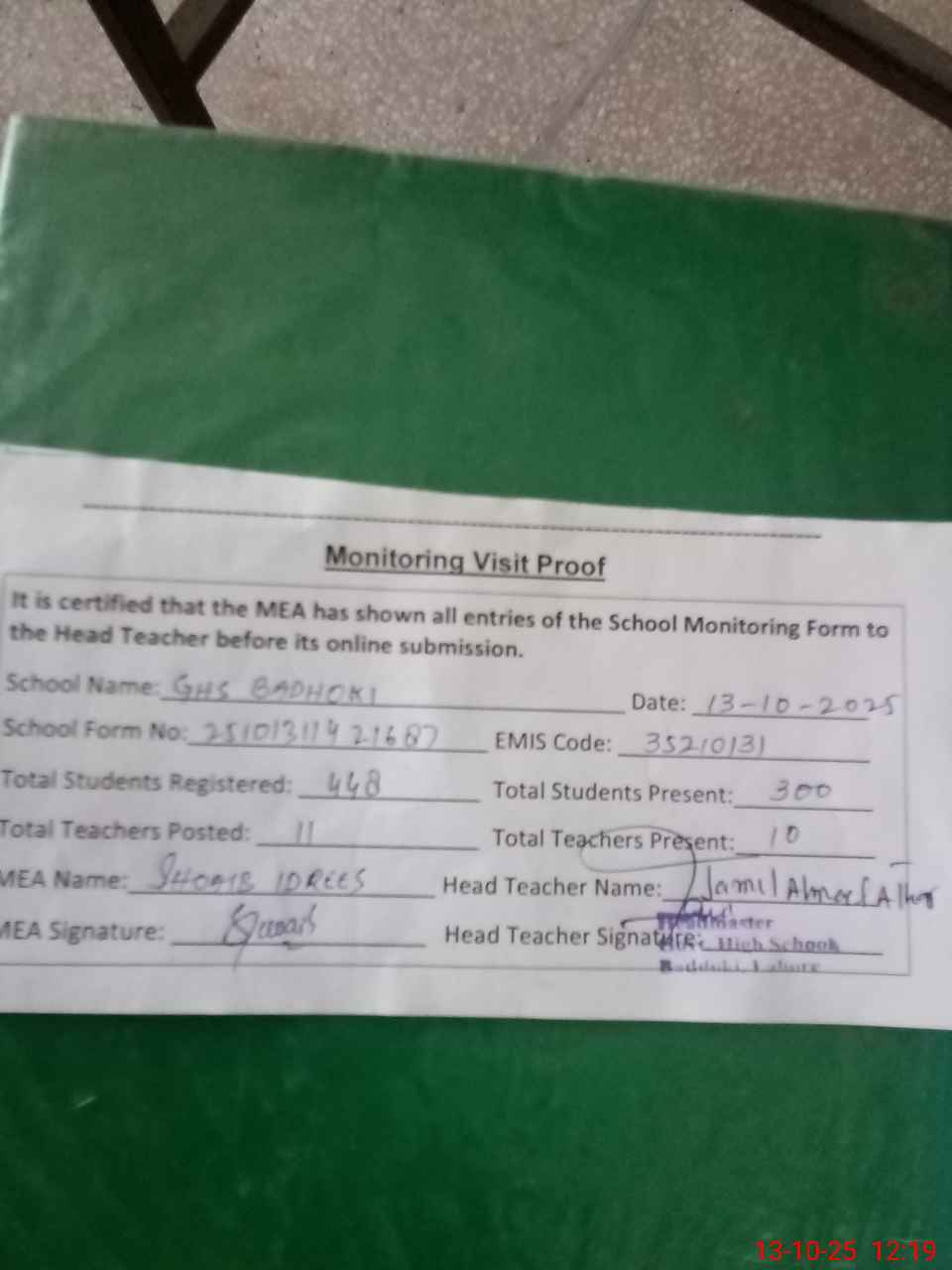 | Certified that this School was Inspected by the Undersigned MEA/DMO Today and the Information Stated Above is as Per Record. | |||||