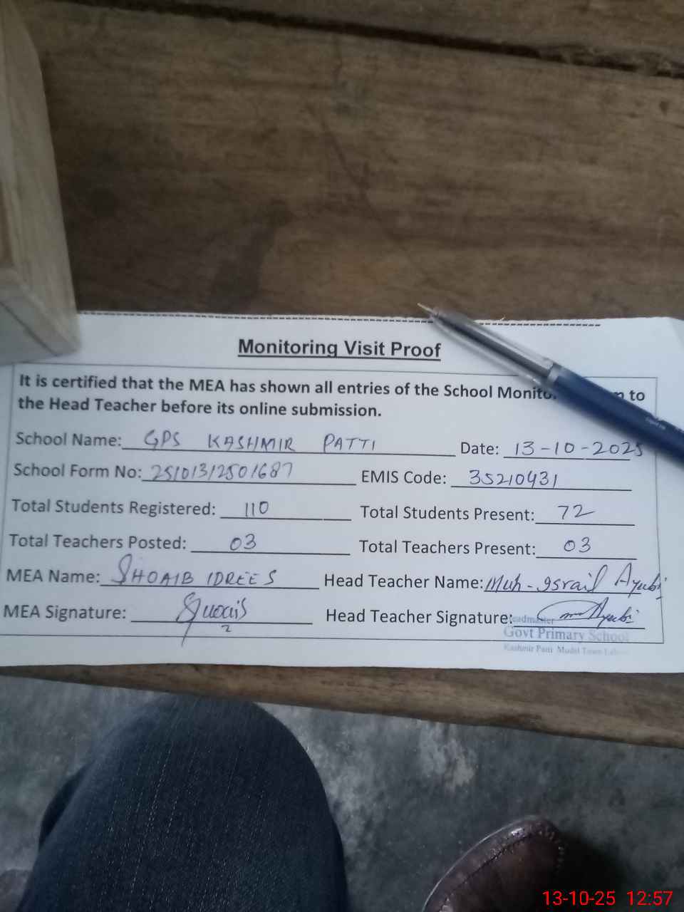 | Attendance Register | Head Teacher | MEA with School | Visit Proof |