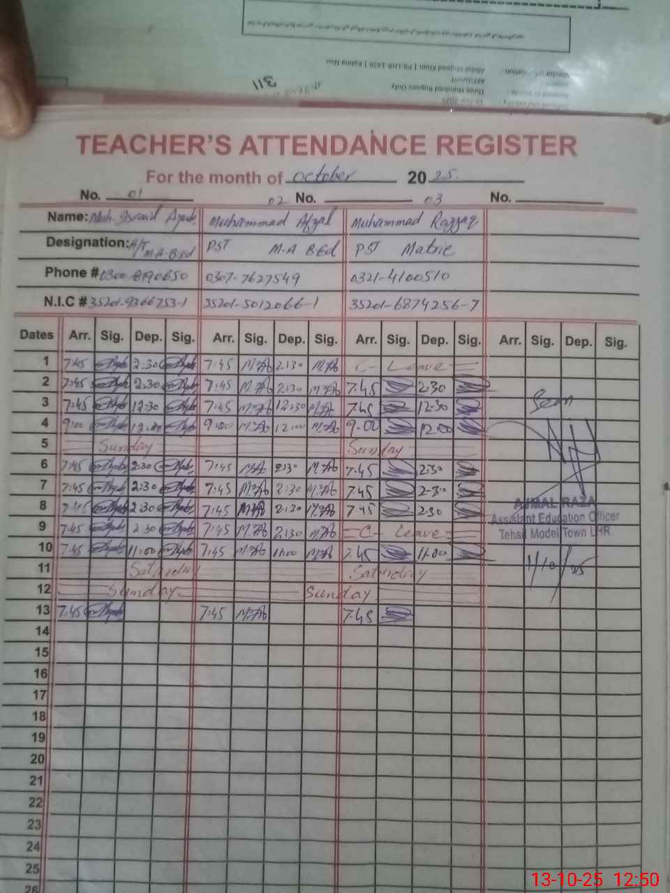 | CNIC | Full Name | Designation | R/C | Absence during last cal. month |
