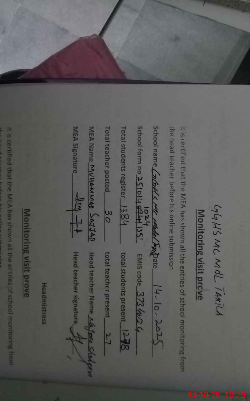 | Certified that this School was Inspected by the Undersigned MEA/DMO Today and the Information Stated Above is as Per Record. | |||||