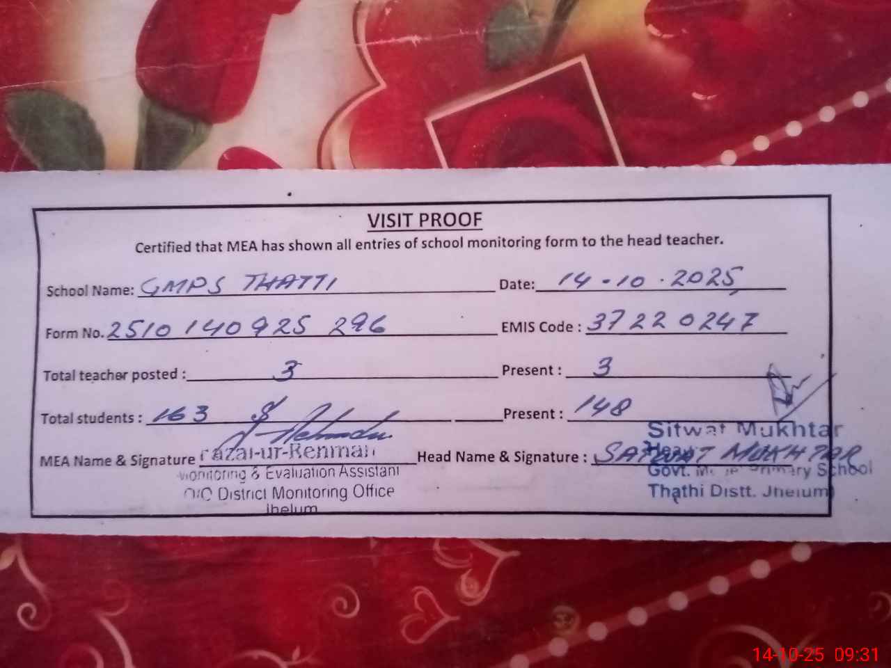 | Certified that this School was Inspected by the Undersigned MEA/DMO Today and the Information Stated Above is as Per Record. | |||||