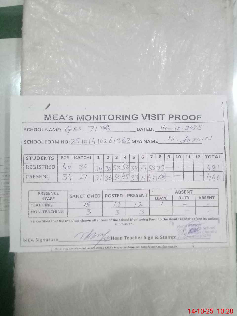 | Attendance Register | Head Teacher | MEA with School | Visit Proof |