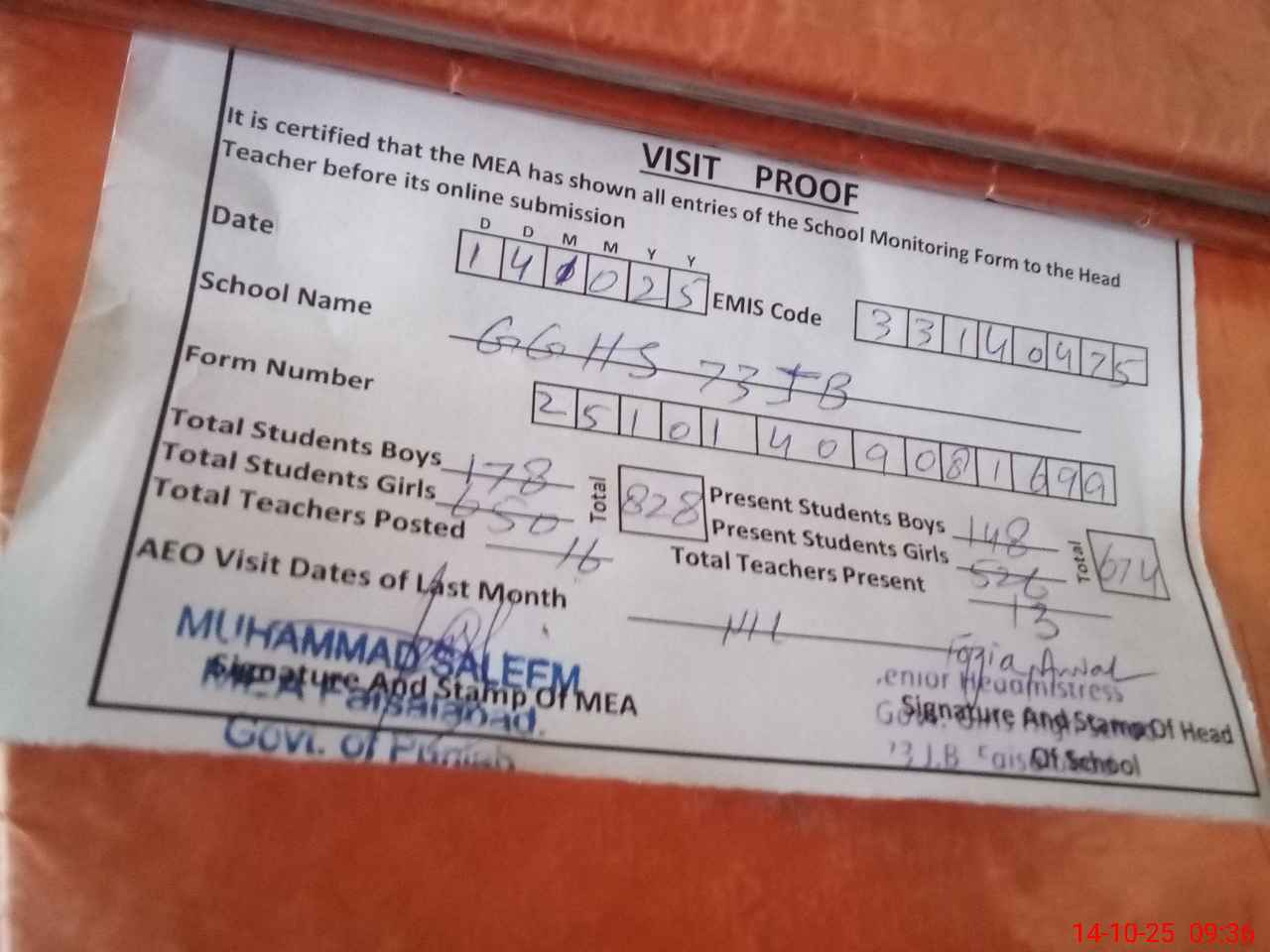| Attendance Register | Head Teacher | MEA with School | Visit Proof |