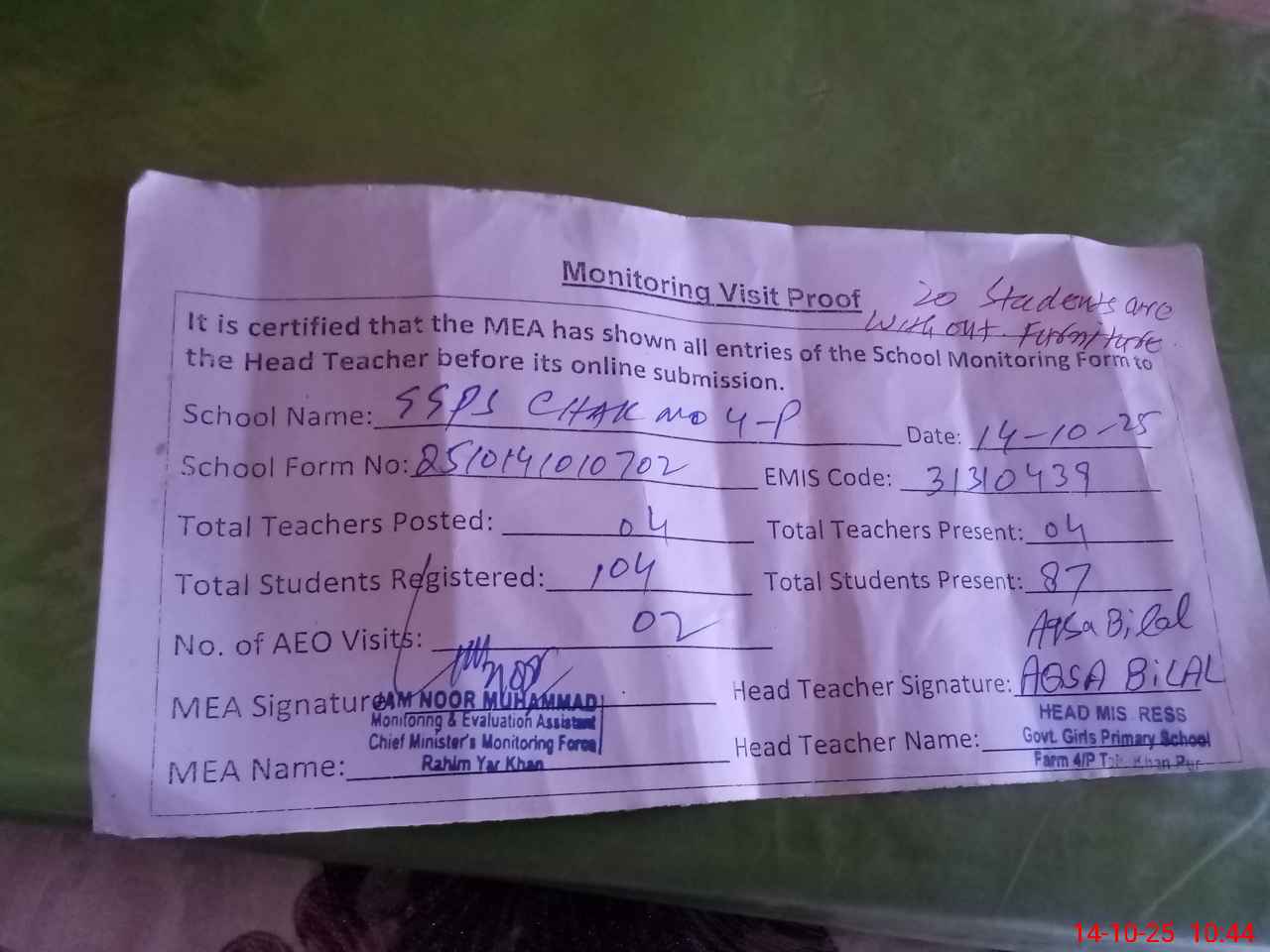 | EMIS Code: 31310439 | Name of School: GGPS CHAK NO 4/P | |||