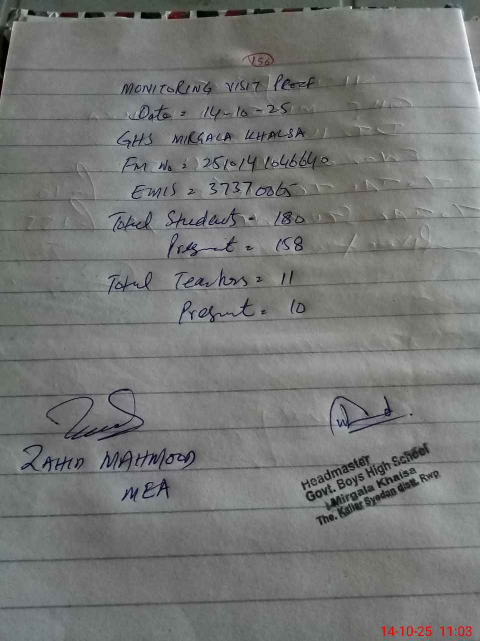 | Monitoring Date: 14-10-2025 | Start Time: 14-10-2025 10:30 AM | End Time: 14-10-2025 11:06 AM | Name of MEA: Za**** Me**** | |