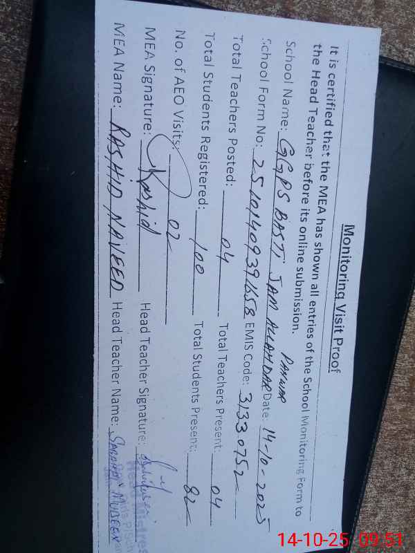 | EMIS Code: 31330752 | Name of School: GGPS BASTI JAM ALLAH DAR PANWAR | |||
