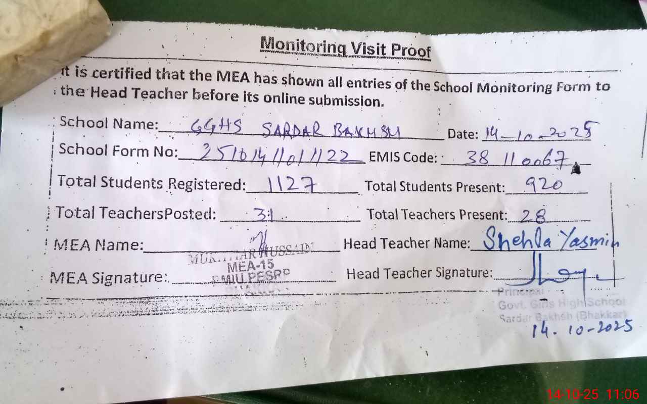 | EMIS Code: 38110067 | Name of School: GGHS SARDAR BAKHSH | |||