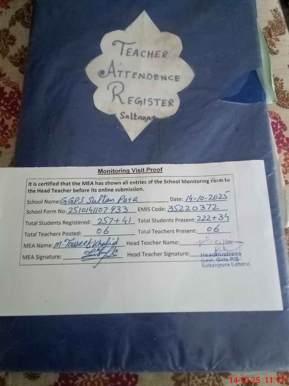 | Attendance Register | Head Teacher | MEA with School | Visit Proof |