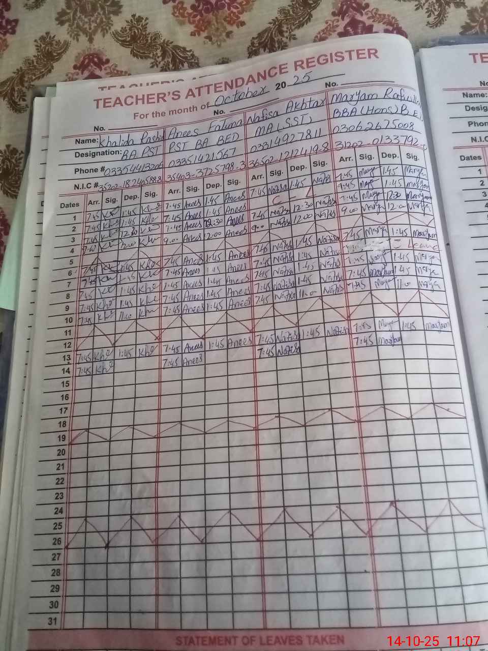 | CNIC | Full Name | Designation | R/C | Absence During Last Calender Month |