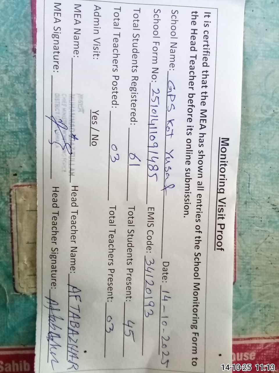 | EMIS Code: 34120193 | Name of School: GPS KOT YOUSAF | |||