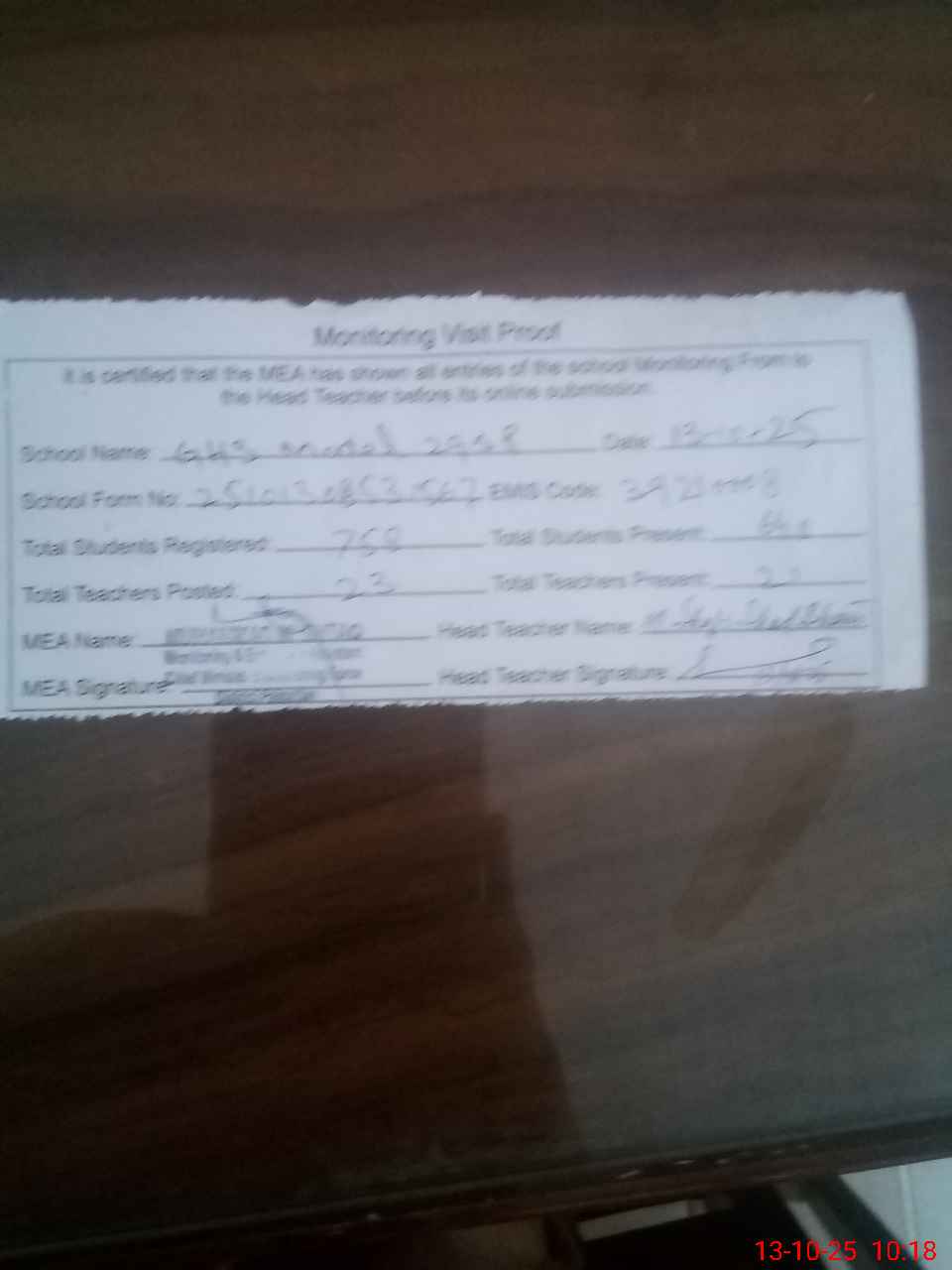 | Attendance Register | Head Teacher | MEA with School | Visit Proof |