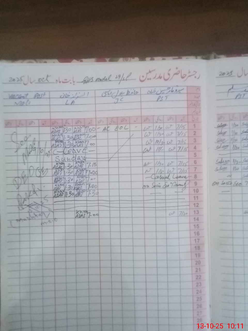 | CNIC | Full Name | Designation | R/C | Absence During Last Calender Month |