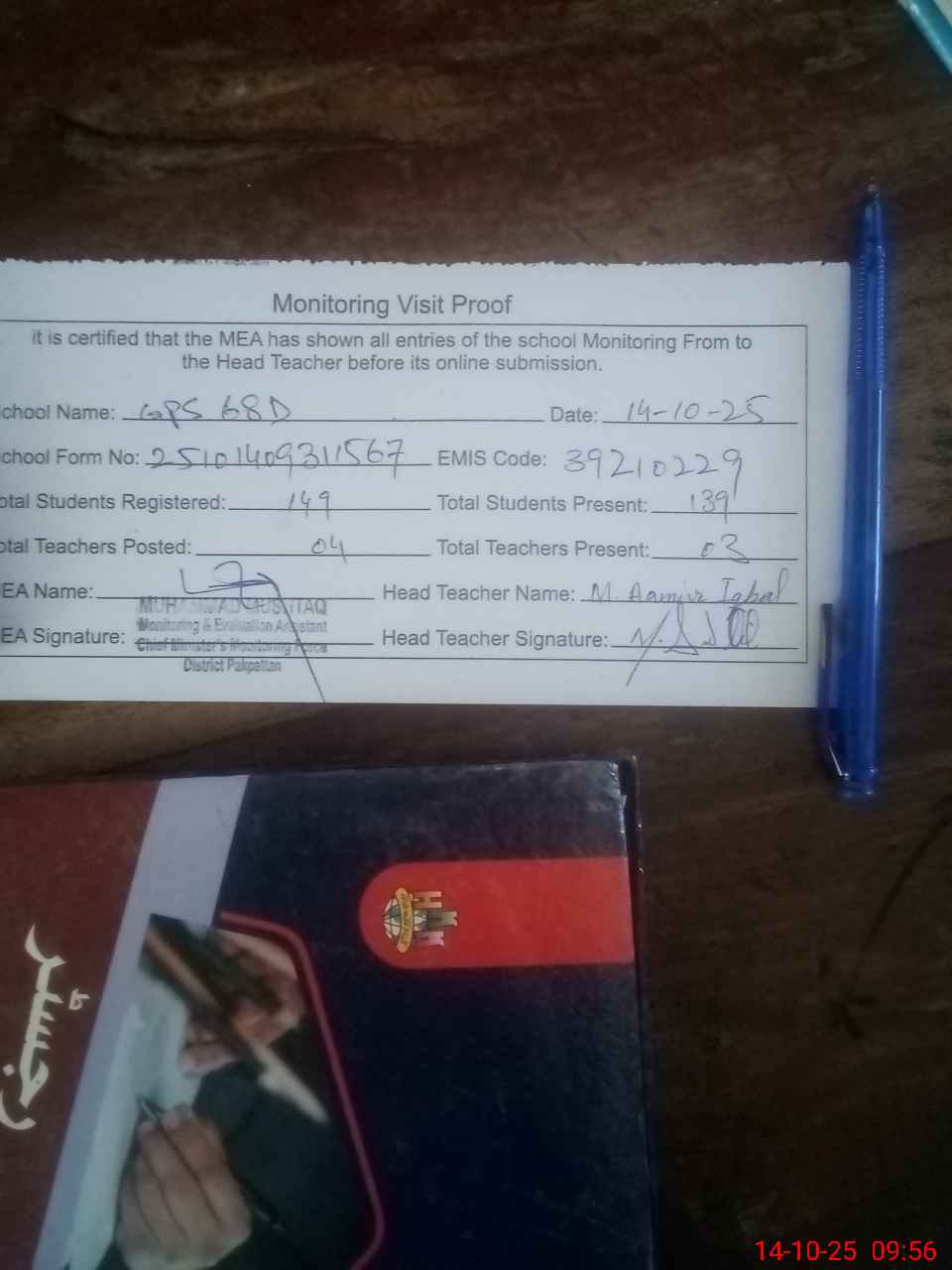 | Attendance Register | Head Teacher | MEA with School | Visit Proof |