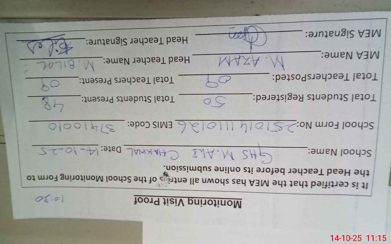 | Certified that this School was Inspected by the Undersigned MEA/DMO Today and the Information Stated Above is as Per Record. | |||||