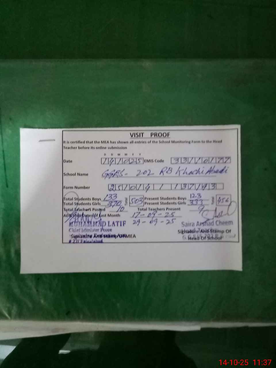 | Certified that this School was Inspected by the Undersigned MEA/DMO Today and the Information Stated Above is as Per Record. | |||||