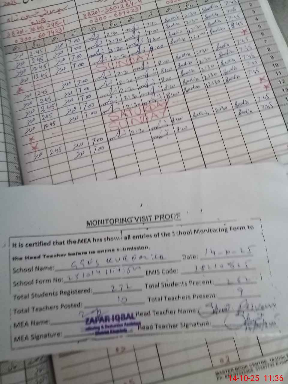 | Attendance Register | Head Teacher | MEA with School | Visit Proof |