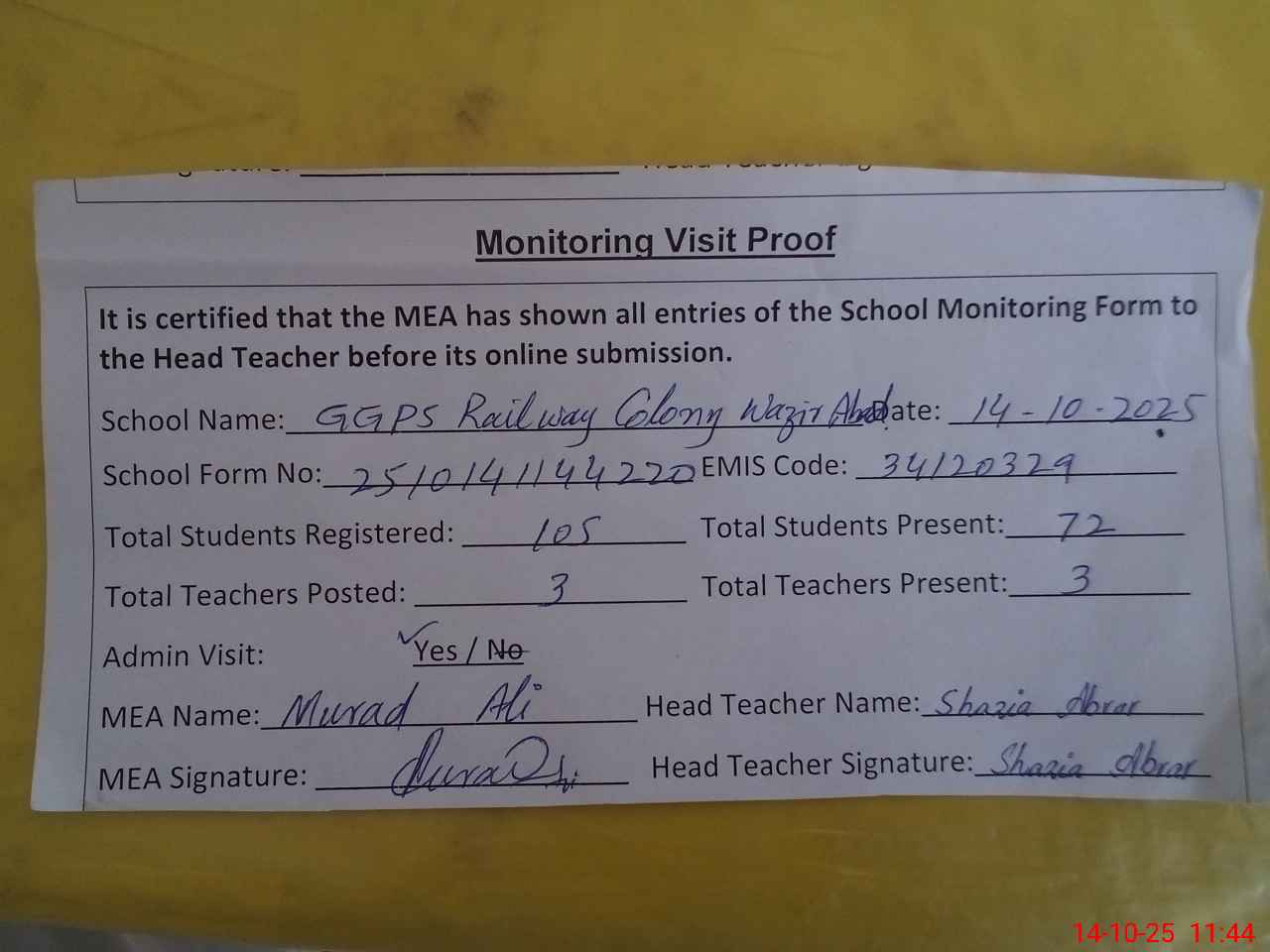 | Attendance Register | Head Teacher | MEA with School | Visit Proof |