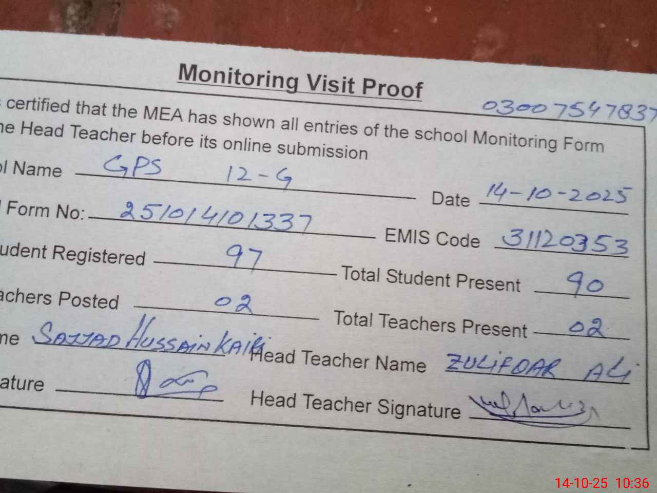 | EMIS Code: 31120353 | Name of School: GPS CHAK NO 12/G | |||
