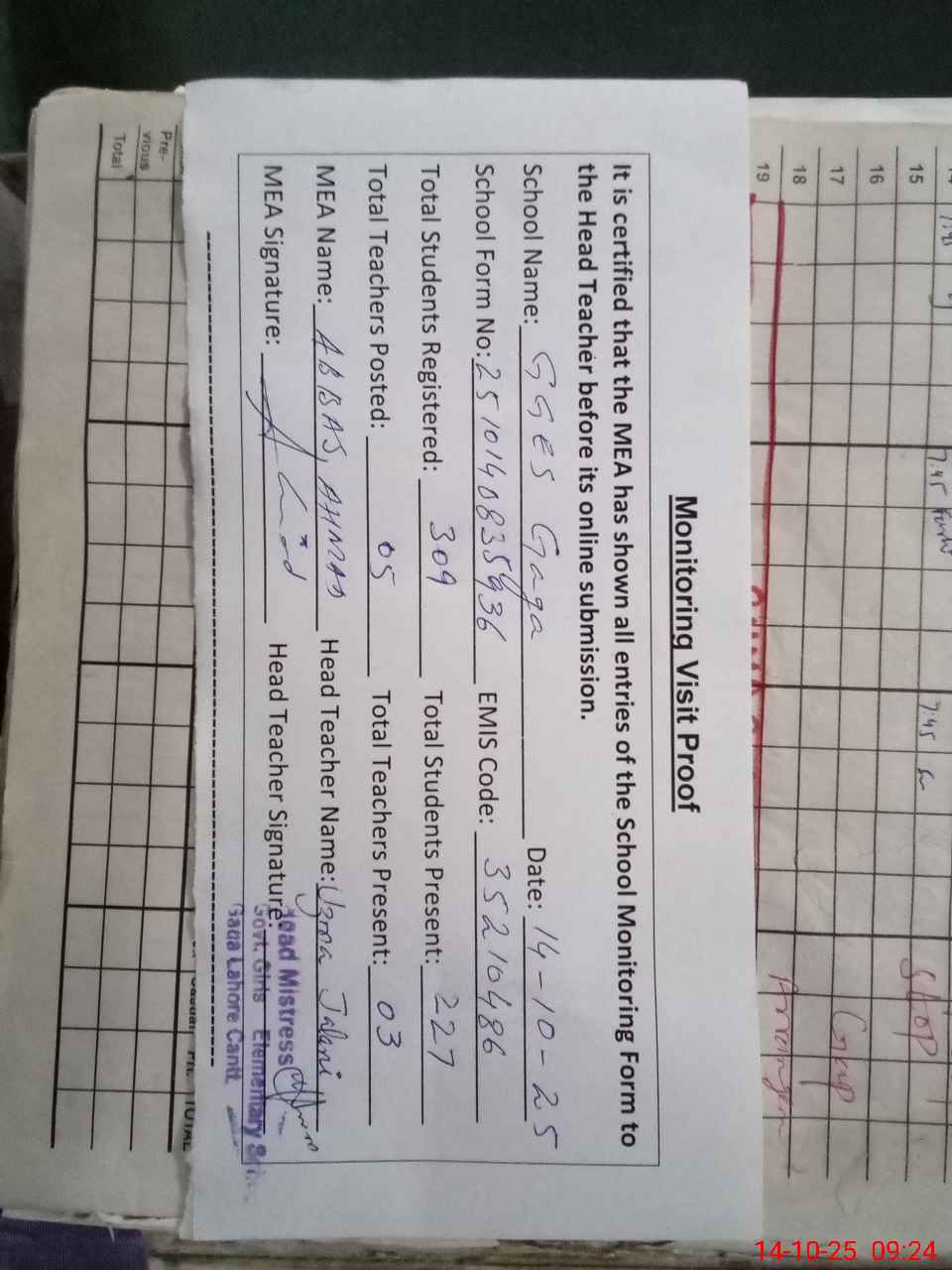 | Certified that this School was Inspected by the Undersigned MEA/DMO Today and the Information Stated Above is as Per Record. | |||||